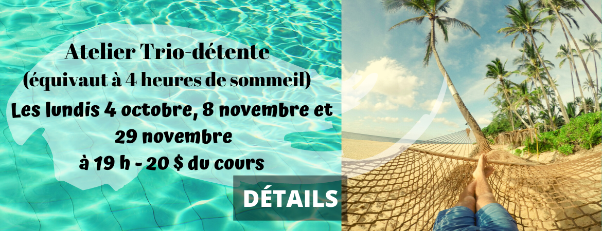 Atelier Trio-détente (équivaut à 5 heures de sommeil) Published octobre 17, 2021 - size: 1170 × 450 in Atelier Trio-détente (équivaut à 5 heures de sommeil) ← Previous Next →